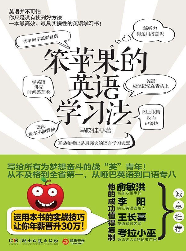 《笨苹果的英语学习法》是一本英语学习指导工具书。疯狂英语创始人李阳、新东方校长俞敏洪、英语沙龙社长郭蕾、畅销书作家考拉小巫均推荐了《笨苹果的英语学习法》书稿。它将励志和英语学习方法相结合,市面上的英语学习书,很少会教方法,而是灌输知识,家长们最愁的就是孩子不愿意学英语。2/3的英语学习者都是在被迫学,《笨苹果的英语学习法》目的在于教学生用正确的方法高效地学习英语。“授人以鱼不如授人以渔”,在《笨苹果的英语学习法》中,作者用自己的亲身经历告诉读者:即便不出身名校,即便不天资聪颖,只要遵循方法,依然可以让英语成绩从不及格到全省第一,从聋哑英语蜕变为英语专业八级口译。